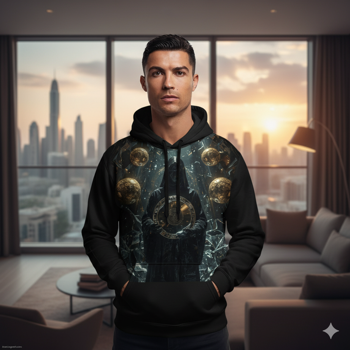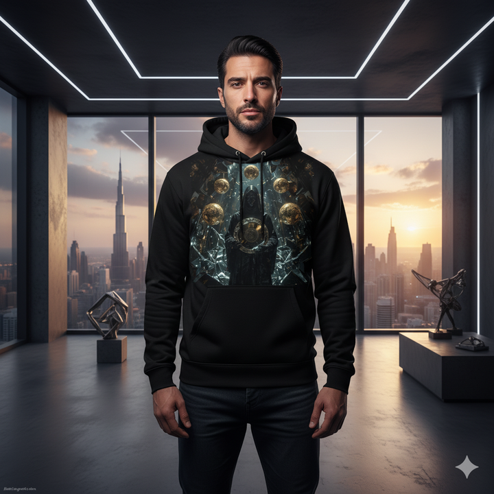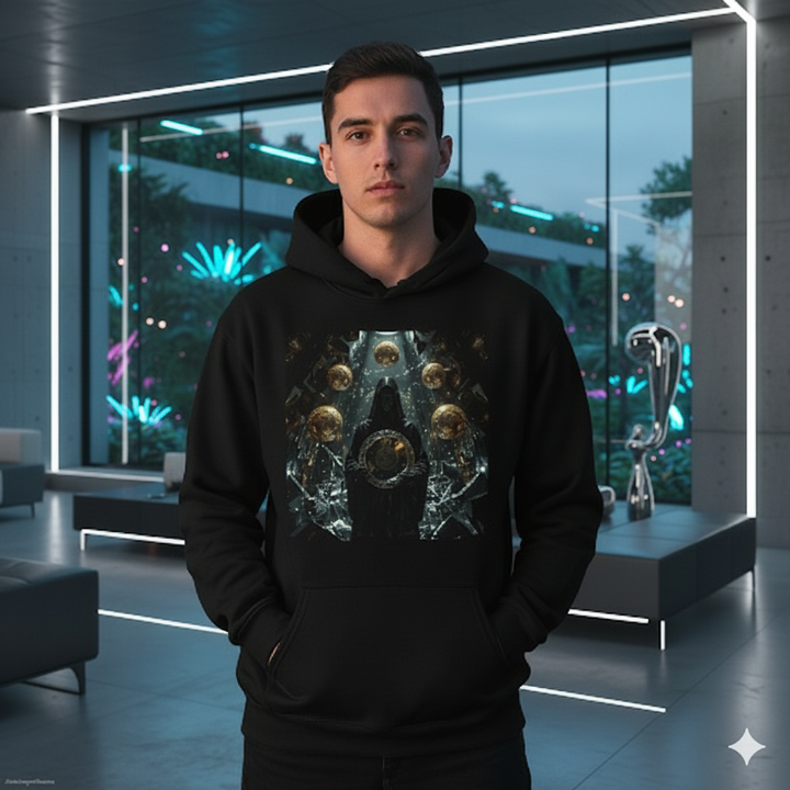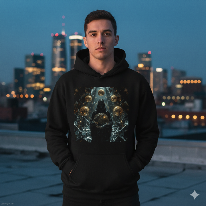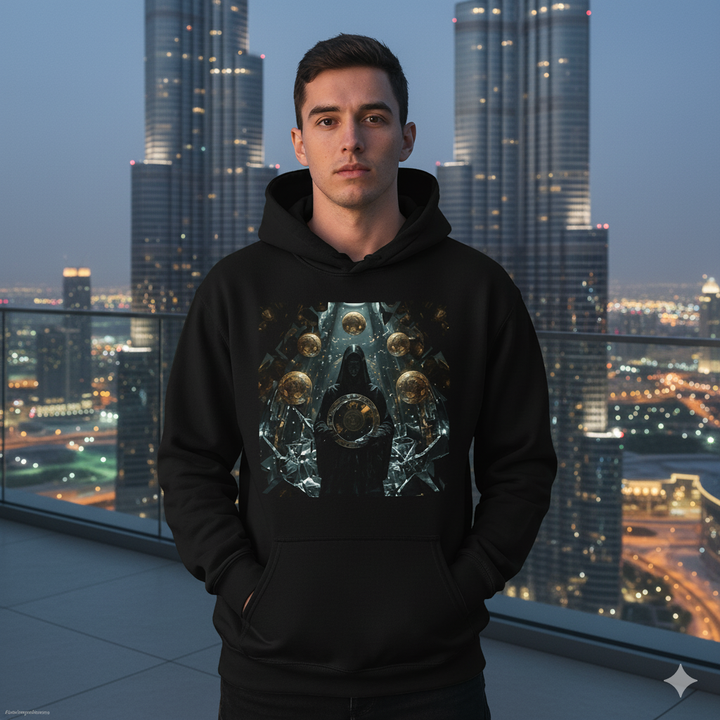 “The Gatekeeper” is crafted on a luxury heavyweight silhouette, infused with ultra-premium textures and metallic detailing that captures light like sacred gold. The central artwork depicts the Hooded Guardian, standing between dimensions, holding the sigil of balance and eternity — a motif reserved for those who dare to step into the unknown.