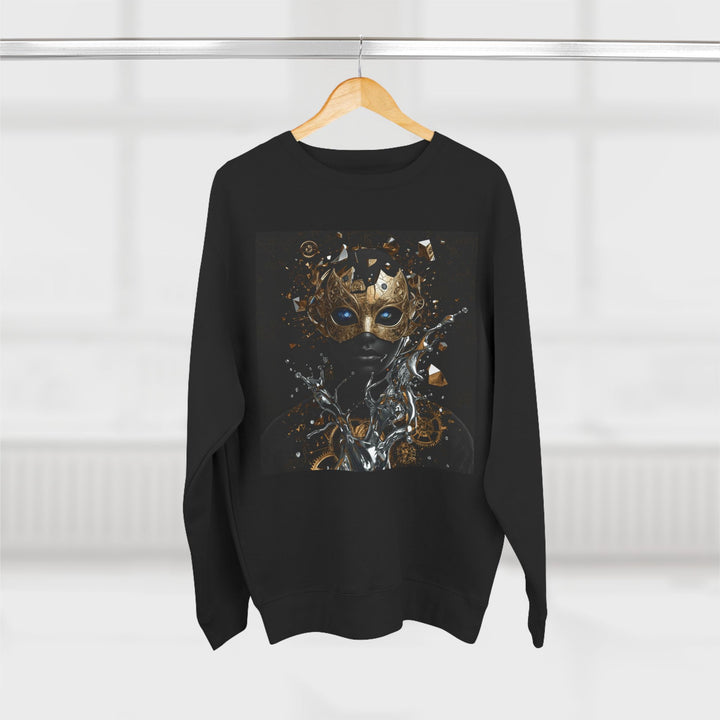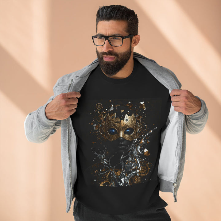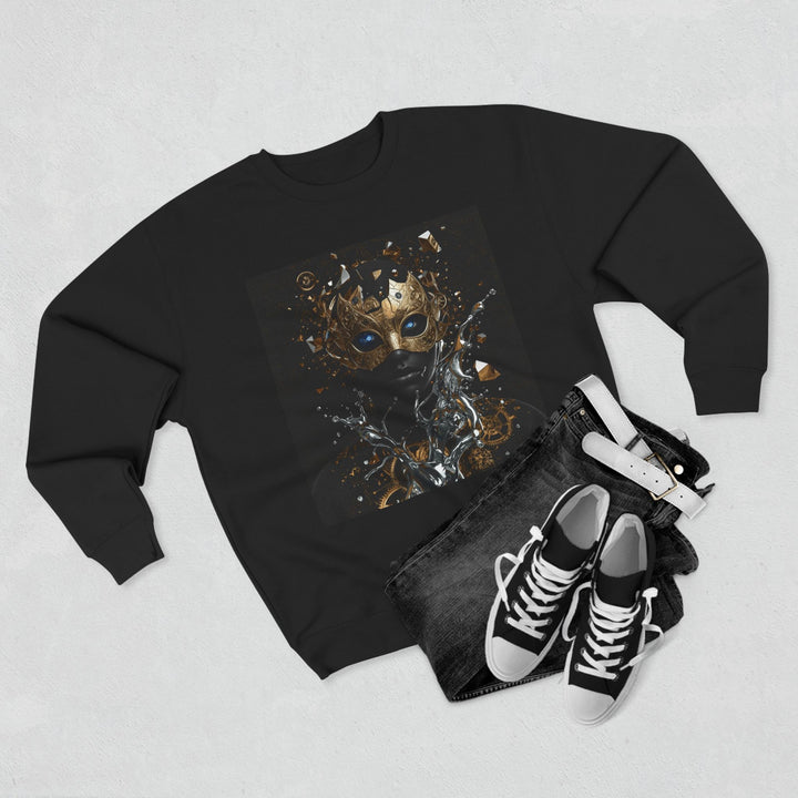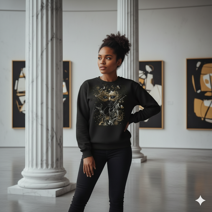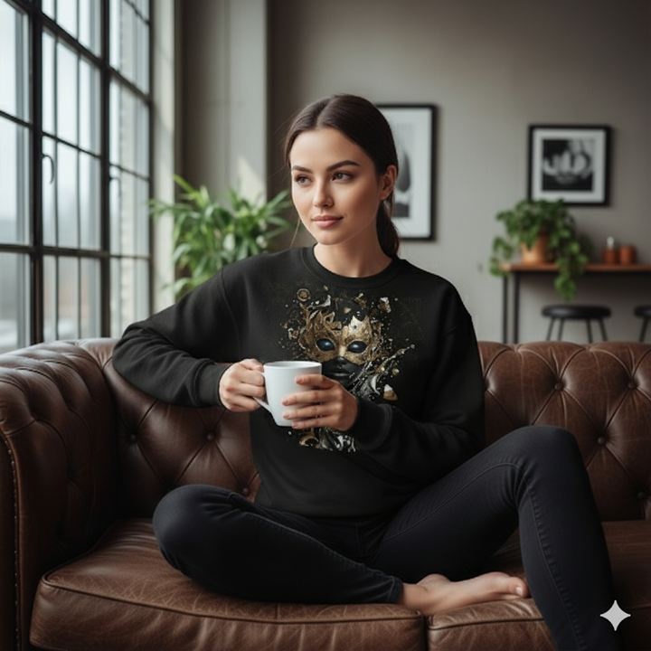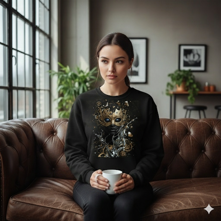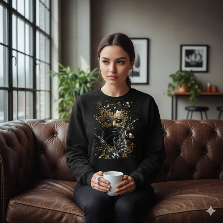 A luxury crewneck sweatshirt that blends minimalism with mystery. Featuring the golden mask with piercing blue eyes floating in liquid-metal distortion, this piece is crafted for thinkers, creators, and visionaries who wear silence as power.